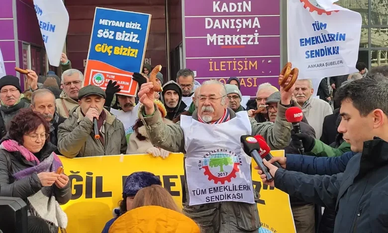 Emekliler “Açlığa, yoksulluğa ve sefalete” karşı “insanca bir hayat hakkı” talebiyle Ankara’da bir ortaya geldi. Sistemin kendilerini bir simide muhtaç…