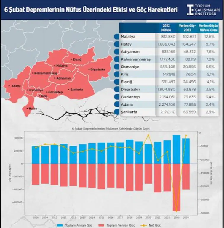 Ankara merkezli fikir kuruluşu Toplum Çalışmaları Enstitüsü tarafından hazırlanan infografik, 6 Şubat 2023’te meydana gelen ve toplamda 11 vilayette ağır yıkımlar yaşatan Kahramanmaraş merkezli sarsıntıların akabinde, zelzeleden etkilenen vilayetlerde yaşanan göç hareketliliğini bilgilerle ortaya koydu.