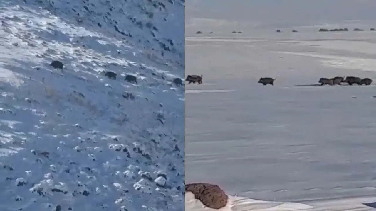 Görüntülerde, kalabalık domuz sürüsünün karla topraklarda ve dağlık bölgede süratle kaçtığı anlar yer aldı.
