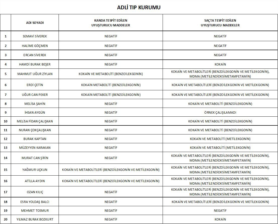 Ünlülere yönelik uyuşturucu soruşturması kapsamında gözaltına alındıktan sonra Adli Tıp Kurumu Başkanlığı’nda uyuşturucu testi veren 20 kişinin test sonuçları belirlendi. Toplamda 15 ismin testi müspet çıktı.