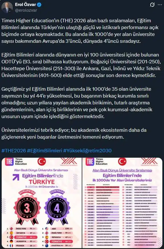 Uluslararası yükseköğretim derecelendirme kuruluşu Times Higher Education (THE) dünya üniversite sıralamalarını açıkladı. Alan bazlı üniversite sıralamalarında, eğitim bilimleri alanında Türkiye; birinci bine 44 üniversite sokarken, birinci 500’de 7, birinci 300’de ise 3 üniversite ile yerini aldı. Türkiye, bu sonuca nazaran kelam konusu alanda Avrupa’da üçüncü, dünyada ise dördüncü sırada konumlandı.